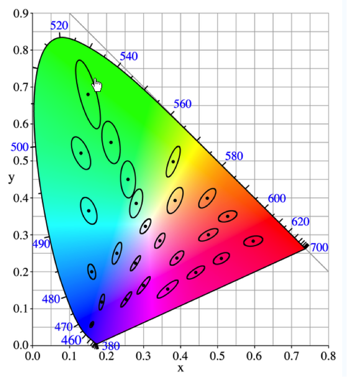 These ellipsoids are all different sizes depending on the position of the color in color space. Some ellipsoids are larger, like those in the green area, allowing more change in color before it is noticeable. Others, like those in the blue and purple area, are much smaller, meaning colors differences can be perceived with much smaller changes.