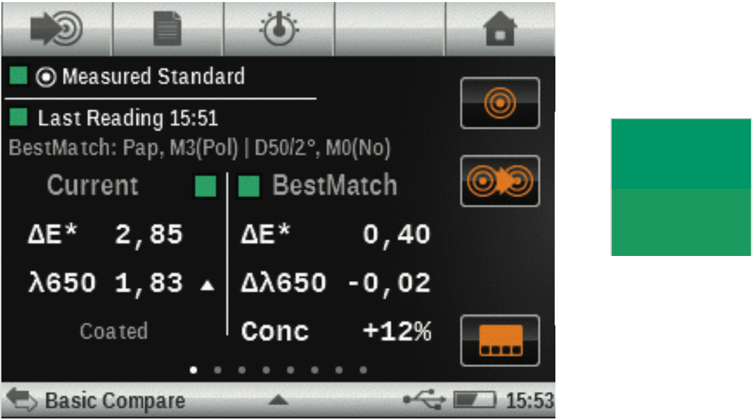 On the right side is the BestMatch. The first value, ∆E of 0.40, represents the estimated color variance from the target after the suggested adjustment is made. The next value, D –0.02, is the suggested negative or positive density adjustment required to hit the BestMatch. This value is useful for offset printers who need to adjust ink by thickness. The last value, +12%, is the concentration adjustment value for gravure or flexo printers.