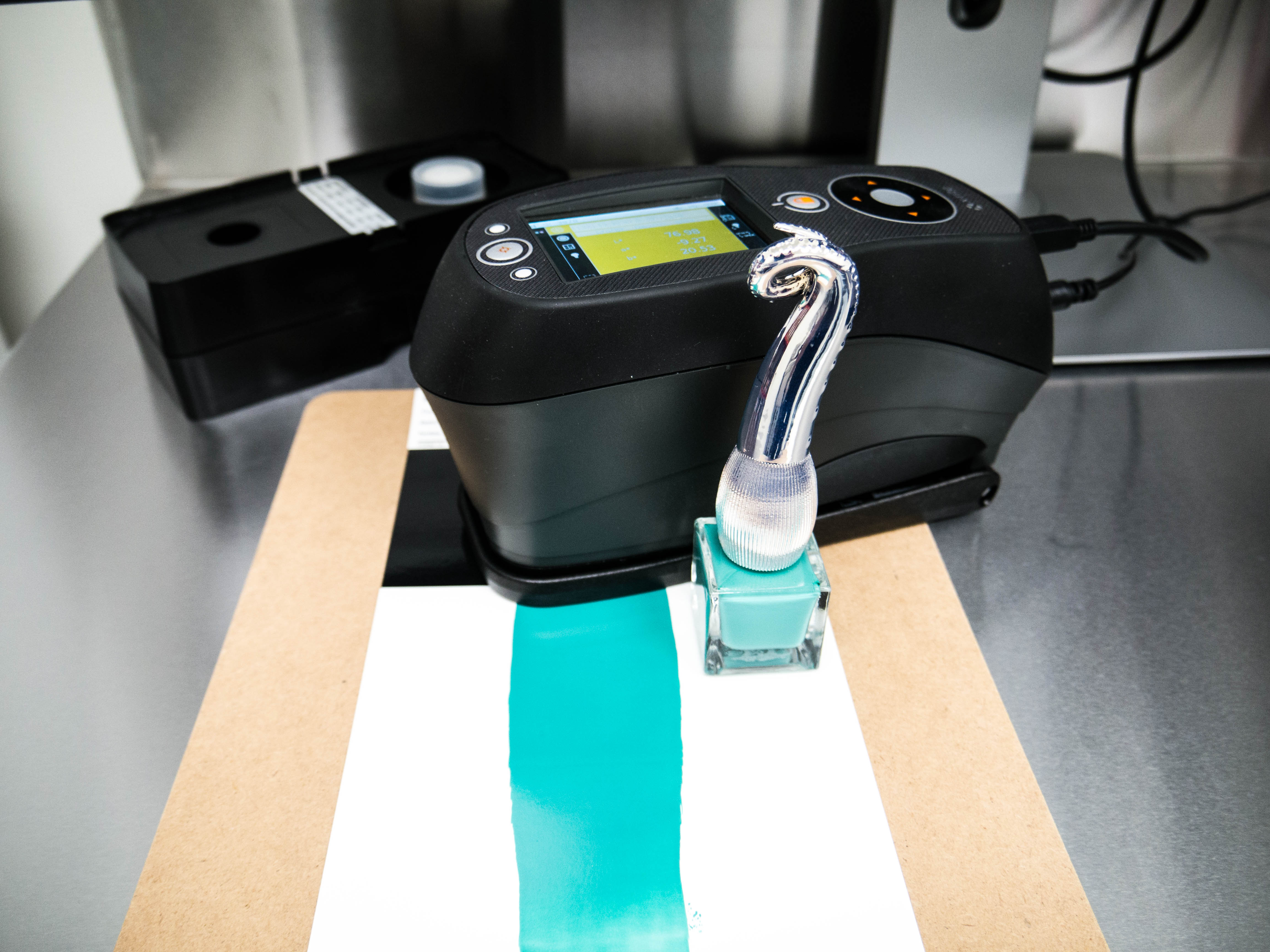 “Customers either select or take an inspiration photo,” Morgan says, “or they can choose a color using the color wheel or from my library. They can then play around with the colors, and save them with meaningful names. Once an order is placed, I use a combination of Color iMatch and software I have designed to extract the color data in L*a*b values and create the formulation recipe. Then it’s usually just a few minutes to mix the color. I judge the outcome by eye, and if an adjustment is required, I can either do a trial-and-error or go back to Color iMatch for a fix. Orders as small as one bottle can be on their way to the customer within hours!”