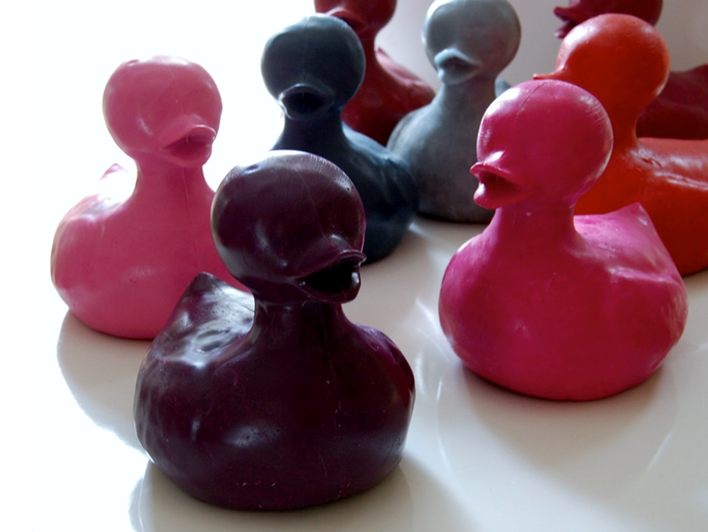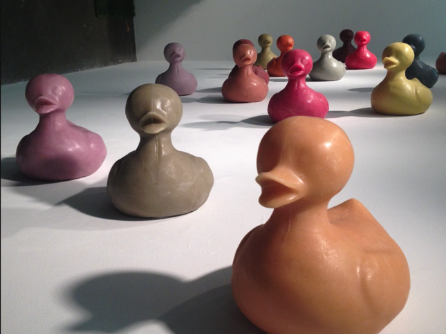 Heather Duffy is the Exhibitions Curator for Urban Institute for Contemporary Arts, where Peoples’ exhibition will be displayed. She was attracted to Michael’s work because of the unique connection he creates between materials and memory – a multisensory experience, complete with visuals and a focus on the sense of smell. “Each of the 200 ducks in The Great Race is created from melted down crayons, the scent of which is closely associated with a strong positive sense of nostalgia in adults. No two ducks are alike, and none were cast out because of imperfection. The freshest and most sturdy ducks which most cleanly mimic the original mold are placed at the very beginning of the race; the farther along the duck is in The Great Race, or up the wall in this case, the more unique, misshapen, ‘scarred,’ or otherwise imperfect it is.”