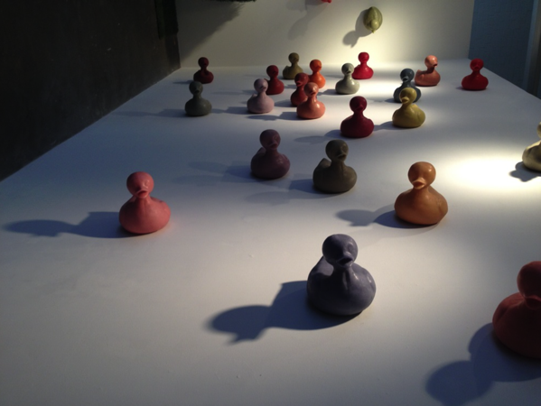 The scent of crayons is one of the most recognizable smells and has a direct correlation with childhood. This year, Peoples is once again using color and scent to evoke an emotional experience with The Great Race. It consists of castings of bright, colorful, rubber ducklings, the same type you’d see in a child’s bathtub or at a carnival. It’s no doubt this work is meant to prompt visitors to reflect on their childhood. Each duck is oversized, so that in an adult hand it represents the scale of the classic toy for a child.
