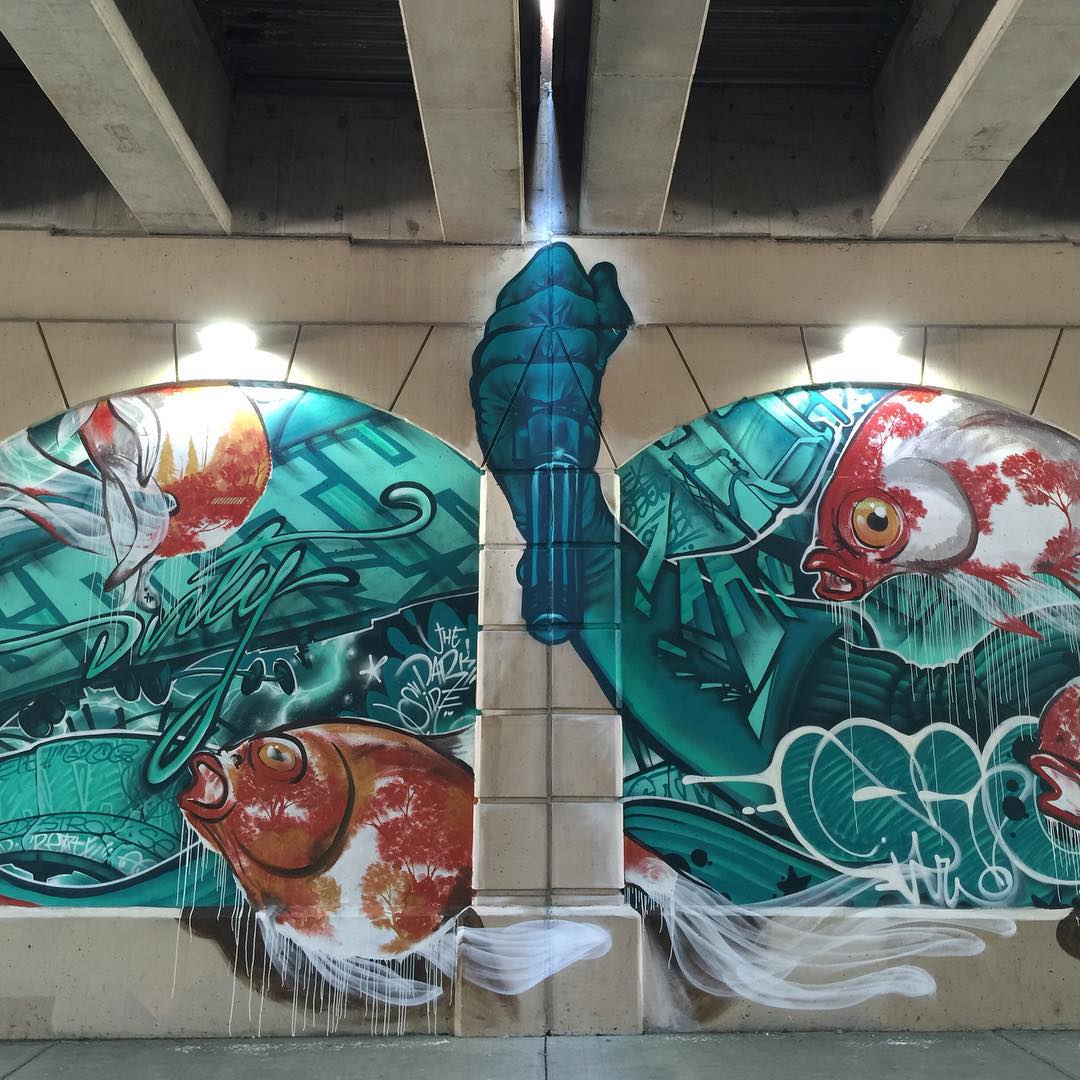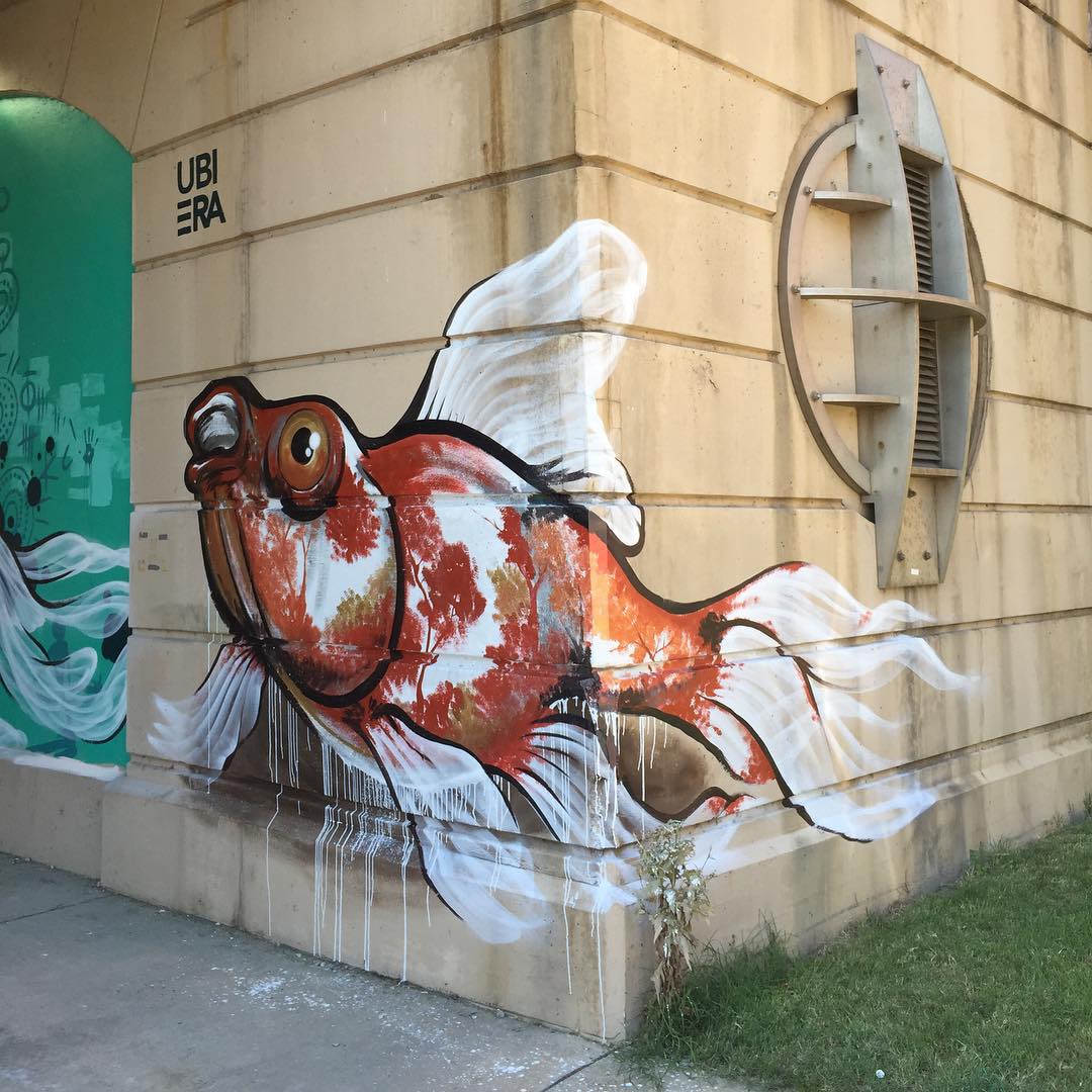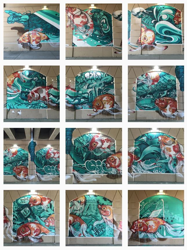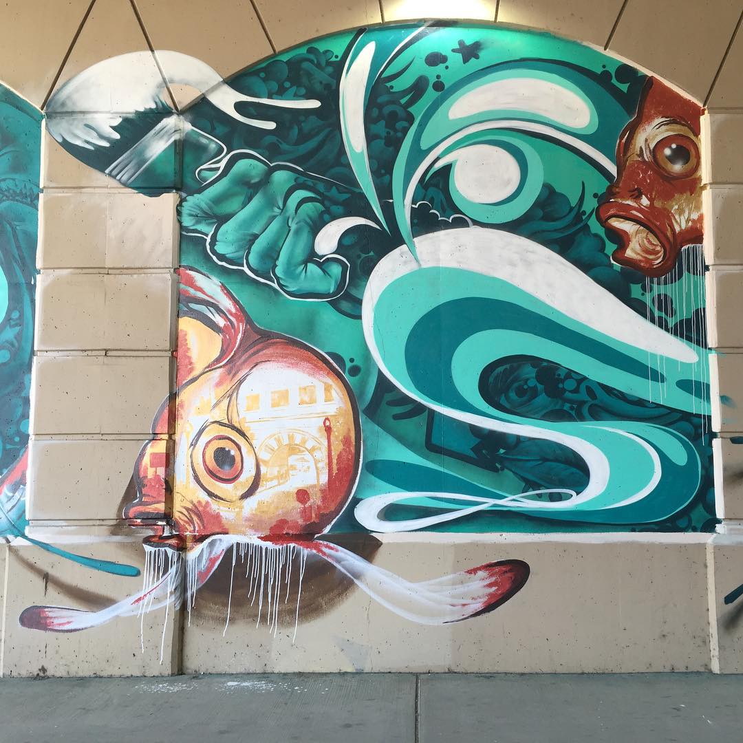 We wondered why Ubiera chose the veiltail goldfish for his mural. He said, “The tails. I envision the ‘flow’ that can be achieved with their tails, plus the three-dimensional aspects of the architecture will help me make them look like they’re floating – it will be cool. I’m hoping to be amazed—and to have viewers be amazed as well—since I have just envisioned this in my mind, planning contrast and color, but I love to just freestyle the figurative imagery once the work gets underway. This way the art is unique to the spot that it is painted on.”